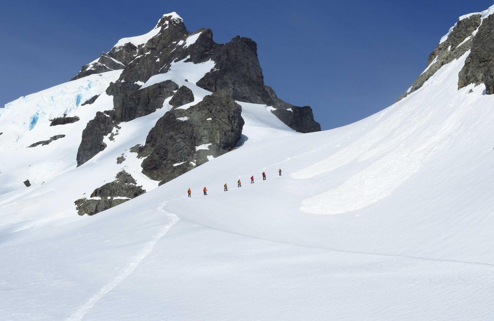 Gray stone peaks sketched with snow, towers of broken blue-white ice, and dramatically different wildlife below and above. You first pass the snow-capped Melchior Islands and Schollaert Channel, sailing between Brabant and Anvers Islands.