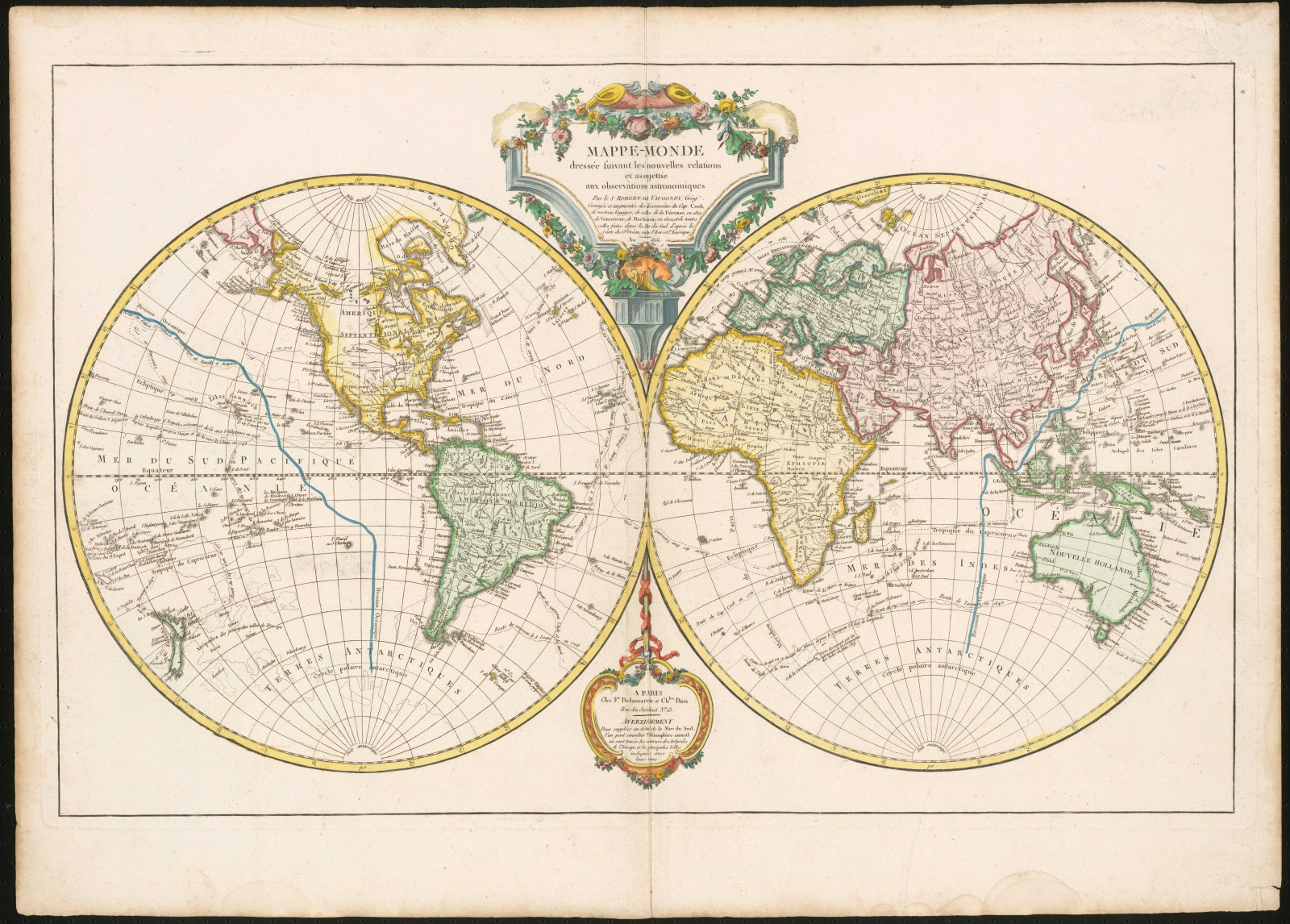 Gilles and his son, Didier, two of the 18th century’s most well-known French cartographers, produced some of the last maps to predate the confirmed 1820 sighting of Antarctica. One of their most extensive maps, the 1749 Mappe-Monde, also omits Terra Australis. The landmass is replaced with the unknown area of Terres Antarctiques, translating simply to “Antarctic Lands.” The version of the Vaugondy map shown in this image was released in 1816 and includes updates resulting from the discoveries of multiple explorers after the original 1749 release.