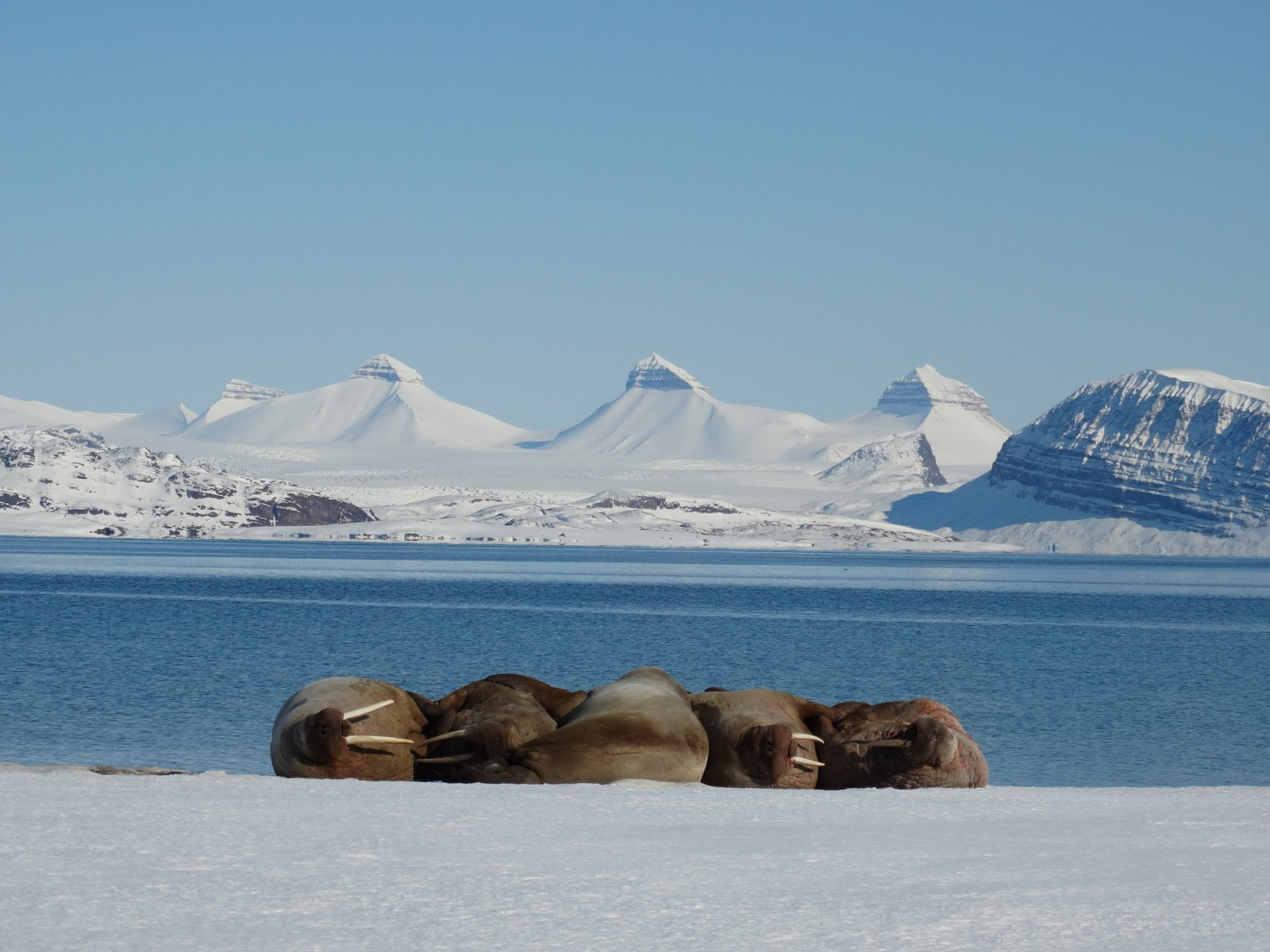 Mostly young adult males, but also a couple of calves, have been observed this evening. There is an interesting sexual segregation in Svalbard: The male walruses (bulls) tend to stay in Spitsbergen, while the females (cows) stick together with their calves and prefer the northeastern parts of Svalbard and Franz Josef Land