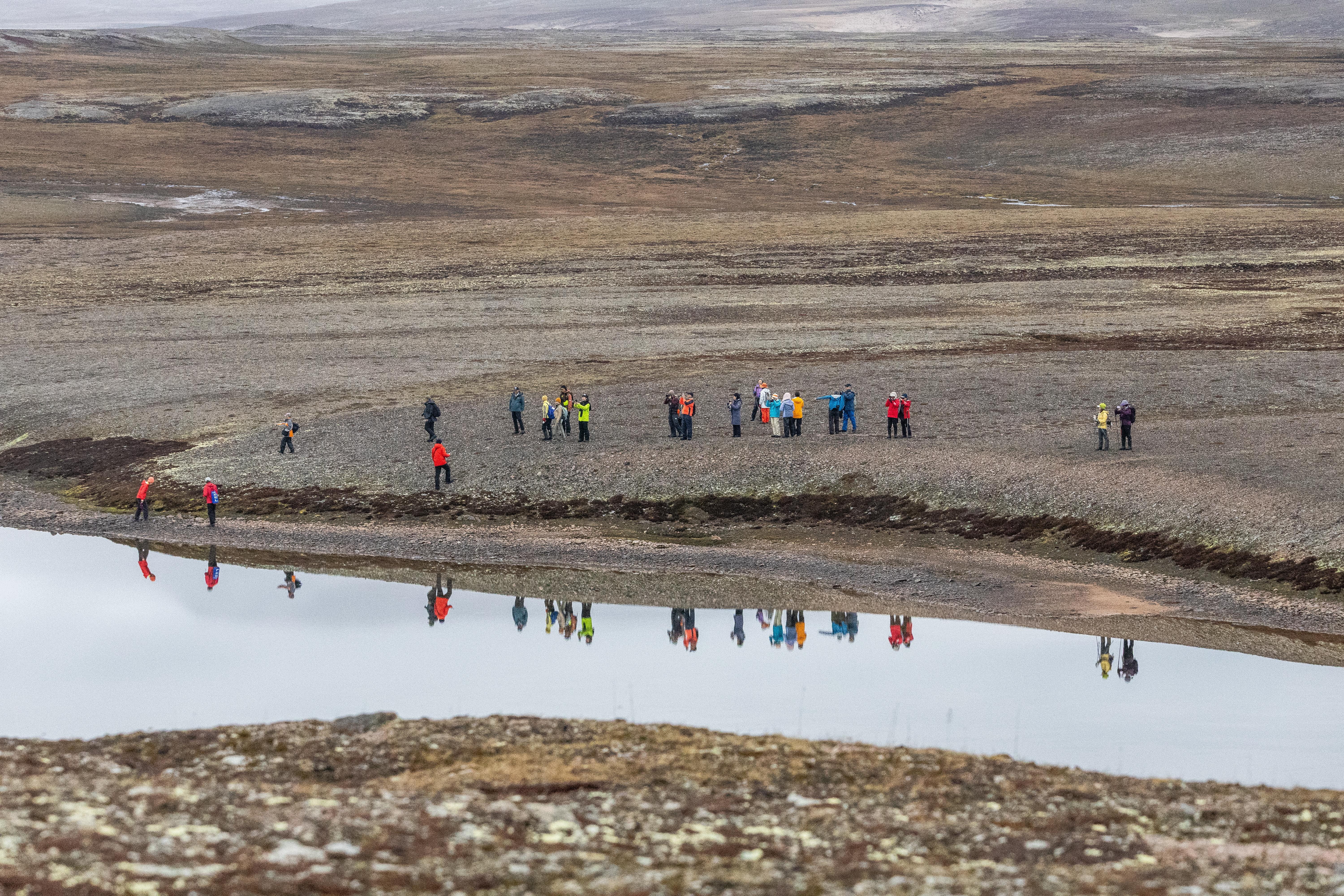 At this time of year, the tundra is especially beautiful, with plants such as dwarf willow, birch, reindeer lichen, cottongrass, and various mosses carpeting the landscape in vivid color. Underfoot, dry leaves and branches crunch and crackle while springy moss flourishes amidst pools of water and icy recesses in the rock.
