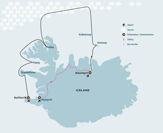 Am Ende unserer Reise steigen Sie in Akureyri aus, wo Sie auf Wunsch mit einem Charterbus (eine sechsstündige Fahrt, die Sie im Voraus buchen müssen) zur Bushaltestelle Harpa Concert Hall and Conference Centre in Austurbakki, Reykjavík, gebracht werden können. Ihre Zeit in der Arktis mag zwar vorbei sein, aber Ihre Erinnerungen und Erlebnisse werden Ihnen für immer bleiben!