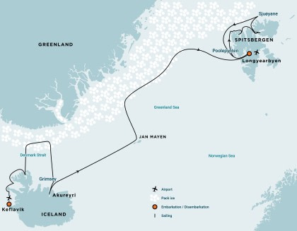 Lassen Sie die magischen Fjorde Islands und die Insel Grimsey hinter sich und begeben Sie sich auf eine Reise ins Packeis der Dänemarkstraße. Machen Sie Halt auf der abgelegenen Insel Jan Mayen, bevor Sie weiter durch das Packeis nach Spitzbergen navigieren. Halten Sie unterwegs Ausschau nach der einzigartigen Tierwelt und wagen Sie sich weiter nach Norden, wo Sie in eine eisige, unberührte Welt eintauchen können.