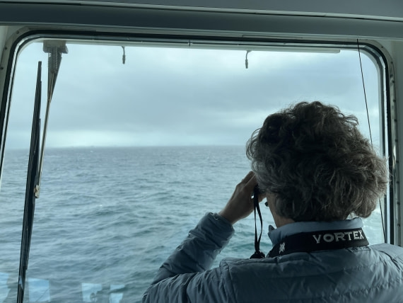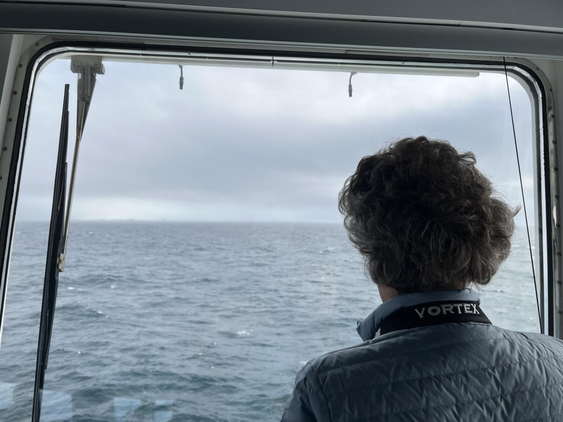 Marcel stood leaning against the dashboard. Through the windows of the captain's bridge, the blurry outlines of approaching land could be discerned. The Hondius ship, gently swaying from side to side and cutting through the waves with its powerful bow, was approaching the Falkland Islands (Malvinas).