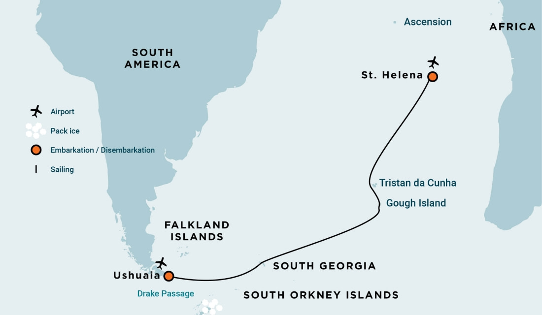 Este extenso viaje de expedición navega a lo largo del Atlántico, visitando varias de las islas más remotas del mundo