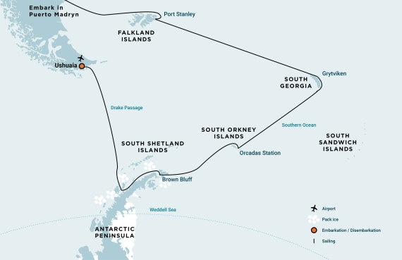 Si les conditions ne sont pas favorables pour entrer dans la mer de Weddell par l'est, le navire mettra le cap sur l'île de l'Éléphant et se dirigera vers le détroit de Bransfield, entre les îles Shetland du Sud et la péninsule Antarctique.