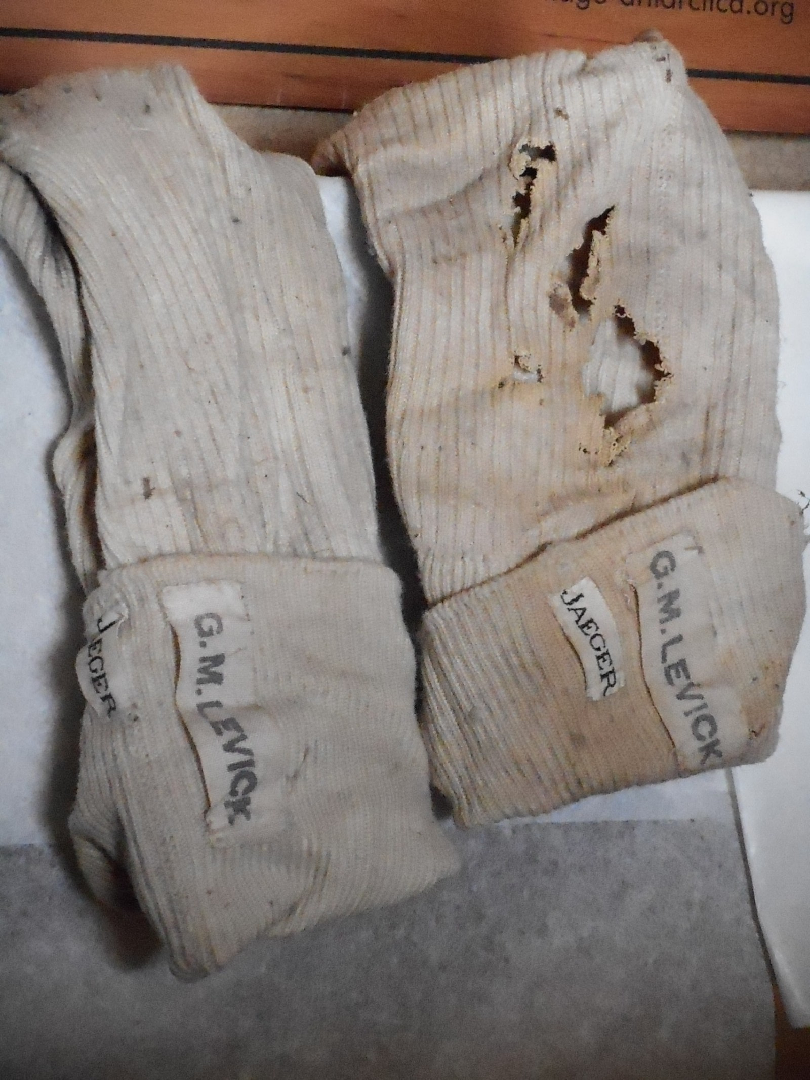 “See the name tag reads ‘Murray Levick’ pause ‘well, he wasn’t on Borchgrevink’s expedition.’” The socks, woollen, beige, stained and with holes tell a story. They are hung over the end of a bunk as though waiting for Santa, or may be drying after a wash. I explain that the socks have come from the now derelict hut next door, home to Captain Robert Scott’s northern party during the 1911 winter. Murray Levick was the doctor and penguin biologist in that party, which used the 1899 hut in which we stand as a work shop, store and quite possibly a laundry.