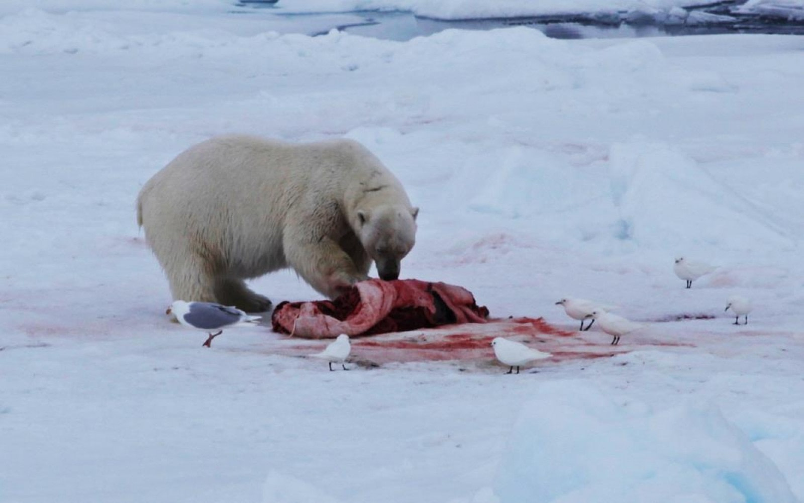 Les Ours polaires qui se nourrissent restent dans les parages et, chose surprenante, laissent les passagers d'un bateau les observer et les photographier.