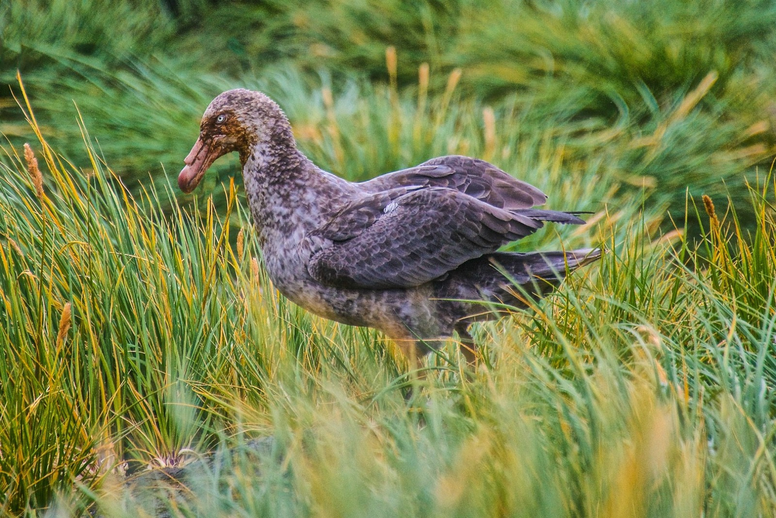 Le Pétrel géant se promène sur les plages de l'île du Roi George comme s'il venait d'apprendre à marcher, bien qu'on le voie plus souvent naviguer dans les airs grâce à sa grande envergure de 180 à 210 cm (71 à 83 pouces).