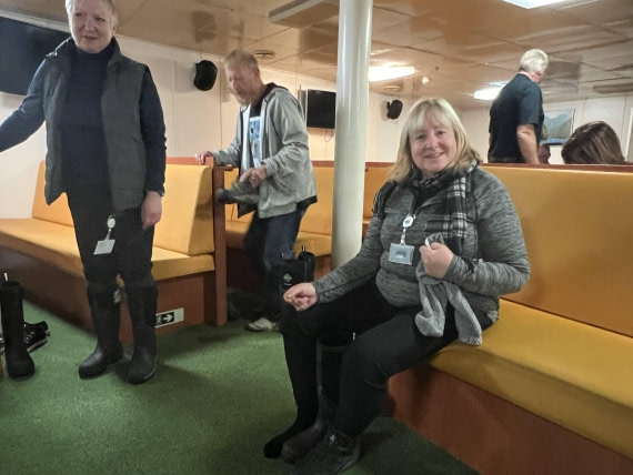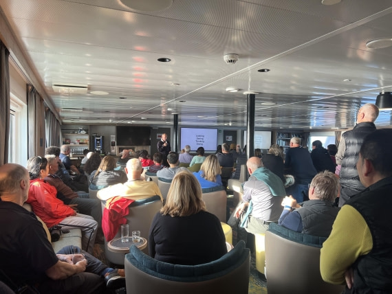 Nous avons été chaleureusement accueillis par l'équipage et le personnel qui nous ont aidés à trouver nos cabines. Nous avons eu le temps d'explorer le navire, de nous orienter et de prendre un café au bar. Tout le monde était à bord à 14 h 45. Il était alors temps de se rassembler dans la salle de conférence pour le briefing obligatoire sur la sécurité du navire. Une fois ce briefing terminé, nous pouvions prendre la mer. Nous avons rencontré Sara Jenner, chef d'expédition, et écouté Sjoerd Van Hoek, officier en chef. Nous avons reçu des informations importantes, notamment sur la manière de se déplacer en toute sécurité à bord du navire, sur ce que nous pouvions et ne pouvions pas faire et sur la manière d'enfiler nos gilets de sauvetage d'urgence. Il était ensuite temps de procéder à un exercice d'abandon du navire. Après avoir entendu l'alarme d'urgence, nous sommes allés dans nos cabines, avons pris nos gilets de sauvetage et nous sommes rendus à notre poste de rassemblement au bar. De là, nous avons été guidés vers nos canots de sauvetage, afin que nous sachions où aller en cas d'urgence réelle.