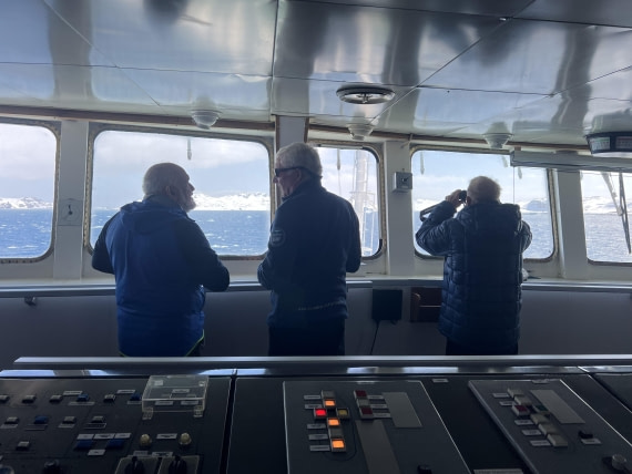 Une fois l'excitation passée, le capitaine Per a remis l'Ortelius à pleine vitesse et nous nous sommes dirigés vers le canal de Beagle. Le capitaine Per nous a ensuite invités à le rejoindre au bar pour boire du champagne et déguster des canapés, lever nos verres et porter un toast au voyage qui s'annonce. Le directeur de l'hôtel, Volodymyr, nous a ensuite présenté les services offerts à bord et notre illustre chef, Sara, nous a donné une vue d'ensemble de notre expédition. Avant de conclure, nous avons rencontré l'équipe d'expédition et le personnel navigant.