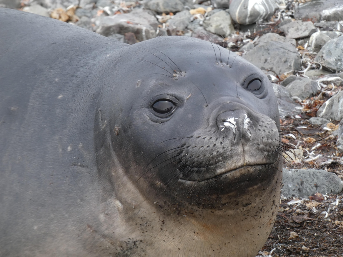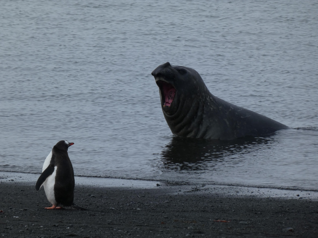 Low-hanging clouds shroud the sky, casting a mysterious aura over this rugged volcanic landscape. Here, dark cliffs contrast starkly with a massive glacier that plunges into the sea, creating an almost Icelandic atmosphere. Elephant Point is aptly named—on the beach, large elephant seals lie in scattered groups, their massive forms visible from afar. But before we can even focus on them, an unexpected visitor makes its presence known.