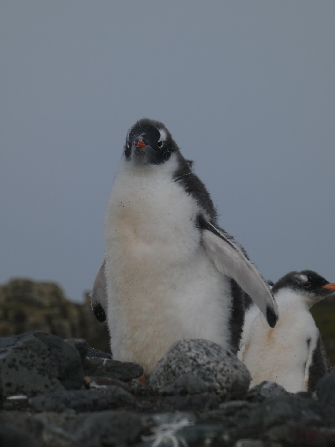 Ali woke us up this morning, to another new sight, as we approached Livingston Island in the South Shetlands. We had sailed through the night from the Antarctic Peninsula and arrived to a pleasant temperature, evidence of a north heading. It was hard to tell from the deck of the boat what was in store for us, but we were quickly grinning from ear to ear when we arrived at the beach. We disembarked at Elephant Point on a beach of black volcanic sand and rock. At first glance, it seemed a little gloomy, but the site was nonetheless teeming with life. Hundreds of Gentoo penguin chicks formed rambunctious groups along the beach. Other more imposing occupants shared the space, male elephant seals. Some lounged in small groups on the beach, and some had even gathered higher up on an embankment. Their wide tracks could be seen in the vegetation as their large bodies compress anything underneath them.