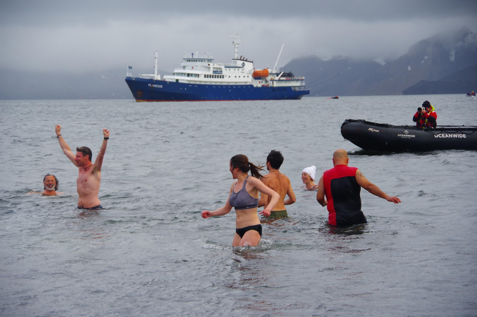 We make the safe choice: regrouping and returning to the Plancius by zodiac. As we board, we meet the rest of the group, who are preparing for an entirely different challenge—the Polar Plunge. Some of us, still buzzing from the paddle, decide to join. The thought of diving into Antarctic waters, inside an active volcano, is irresistible. The moment we hit the freezing water, a shockwave runs through our bodies, every nerve alive. It lasts only seconds, but the exhilaration lingers.