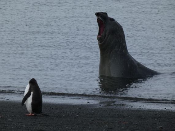 Young male elephant seals have an increasingly prominent nasal appendage as they grow older. A few large territorial males weighing several tonnes could be seen battling it out in the water. At other times, particularly in spring during the breeding season, the males compete to gain access to females and form their harem of several dozen partners. Although they are very agile in the water, they don't seem to be very well adapted to the terrestrial environment. Nonetheless, it is impressive to observe their ability to move very quickly in a crawling motion. Between the rocks, a male fur seal was resting, occasionally poking his head out to take a peek at us. At the end of the route, we had a view of the glacier on Livingston Island and a beach littered with penguins. Some Brazilian scientists had set up camp for the summer season and they came to meet us to exchange greetings. After saying goodbye to the young Gentoo penguins, we re-embarked for lunch and the sailed to Deception Island.
