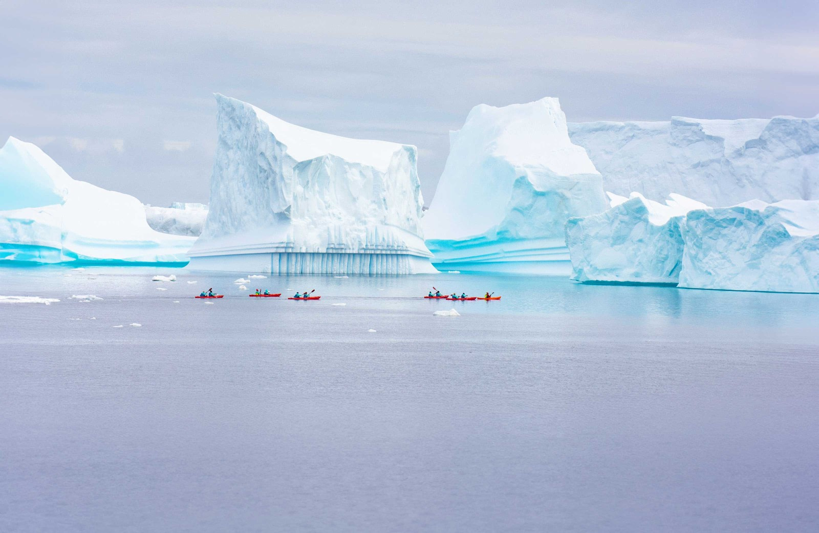 Kajakken is een van de beste manieren om jezelf onder te dompelen in de prachtige blauw-witte wereld van de vredige poolzeeën