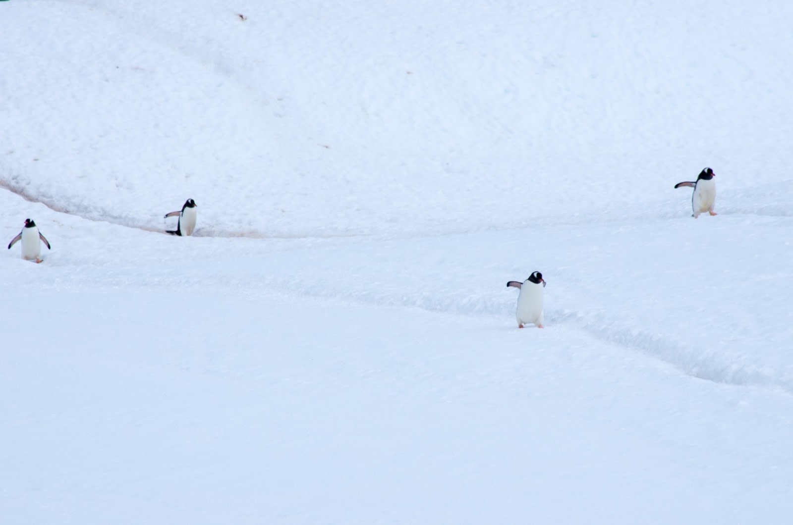 Bij een bezoek aan veel pinguïnkolonies op Antarctica en de Sub-Antarctica kun je vaak deze kriskras door elkaar lopende paden zien, die de routes aangeven die pinguïns nemen als ze zich al waggelend en glijdend een weg banen tussen de oceaan en hun kolonie. Er is geen bepaalde etiquette voor pinguïns die gebruik maken van de pinguïnsnelweg - ze waggelen, waggelen, glijden en waggelen in de richting die ze op moeten, stoppen alleen als ze een pinguïn tegenkomen die de andere kant op komt of stormen voorbij als ze echt haast hebben.