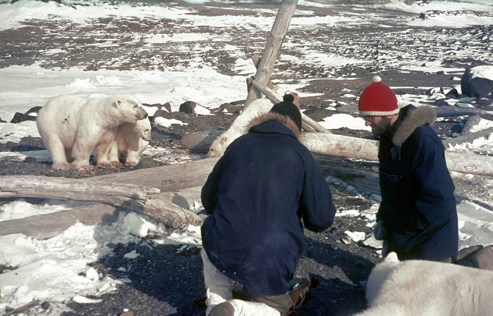 Piet Oosterveld en Ko de Korte merken een mannelijke ijsbeer in het kader van het onderzoek van IUCN naar de populatiegrootte van de ijsbeer. Op de achtergrond wachten eenietwat verdoofde moederbeer en haar twee jongen op hun beurt.