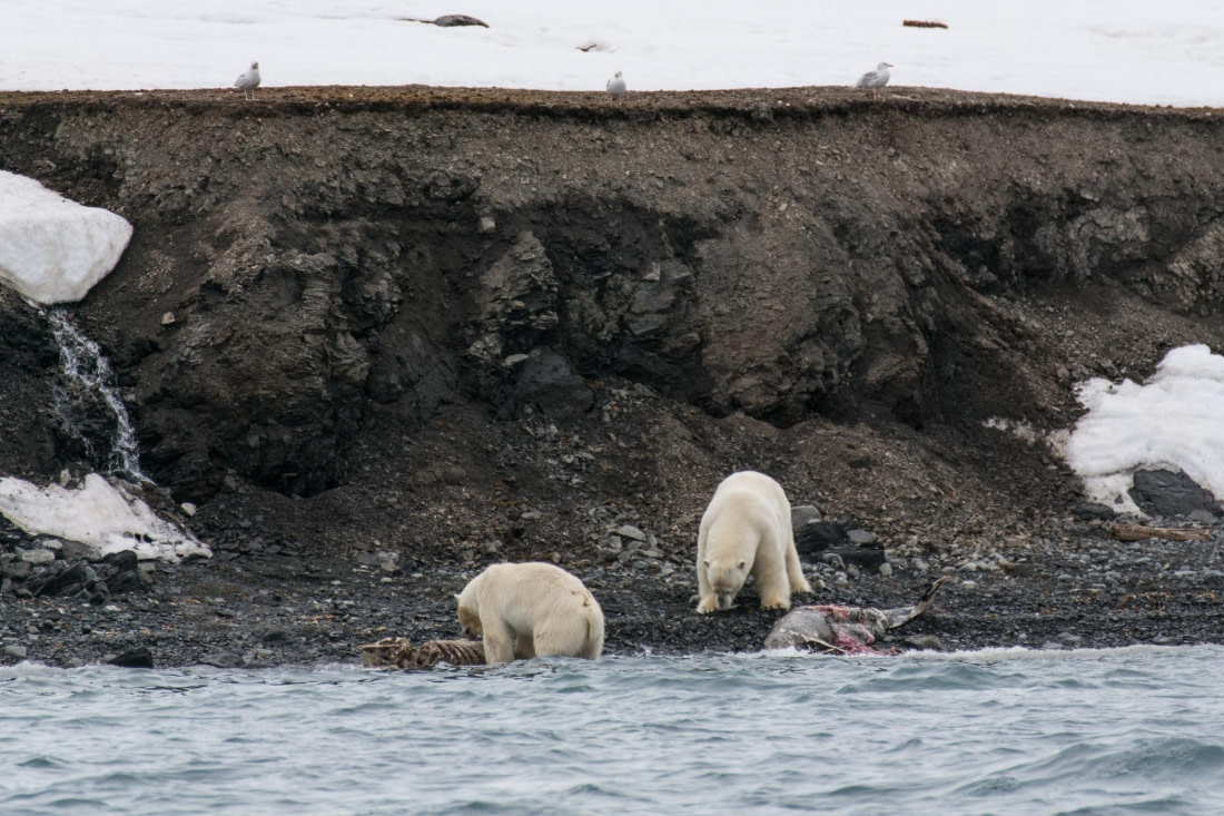 Voor de lunch bereidden chef-kok Ralf en zijn team in de kombuis een heerlijke maaltijd met voor elk wat wils. Terwijl we naar onze middagbestemming, Sorgfjorden, zeilden, stak de wind op en kwam er een beetje mist opzetten. Het expeditieteam scande ijverig de horizon op beren. Zodra het veilig was, kregen we groen licht om naar buiten te gaan voor onze middagactiviteiten, waaronder een gesplitste landing en Zodiac cruise.