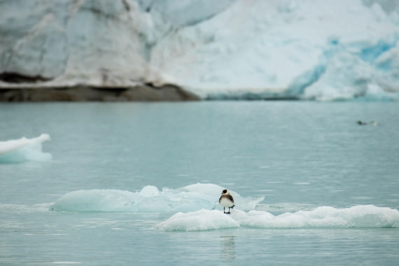 Tijdens de Zodiac cruise leidden onze gidsen ons door Sorgfjorden, waar we ons verwonderden over de bergen en rendieren en Paarse Strandlopers langs de kustlijn zagen. Aan land, in de buurt van de walvisvaardersgraven, waren we blij een Poolvos te zien, nog in zijn wintervacht met een beetje van zijn zomervacht zichtbaar. Deze nieuwsgierige vos bekeek alle nieuwe bezoekers in zijn territorium en we hadden allemaal ontzag voor deze schat van de Poolvos.