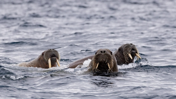 We waren net begonnen met het inladen van de zodiacs, toen via de radio de oproep kwam om onze plannen te wijzigen: de tweede Ijsbeer van de dag was in het gebied. In plaats daarvan maakten we een zodiac cruise en we hadden een prachtig uitzicht op een groep Walrussen. Met hun volumineuze lichamen en lange slagtanden gaf het uitstapje ons de gelegenheid om onze geheugenkaarten te vullen met honderden foto's.