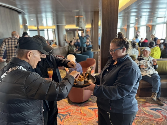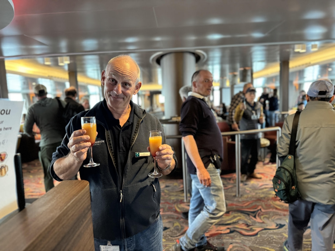 Op de brug zag een groep vroege ochtendverkenners een ijsbeer rondzwerven op de kleine archipel van de Andøyane. De beer plunderde ganzennesten op zoek naar eiwitrijke eieren. Expeditieleider Marcel wekte ons onmiddellijk met het goede nieuws en kapitein Artur stuurde het schip onmiddellijk zodat we een goed zicht hadden vanaf de boeg en de buitendekken, hoewel we beperkt waren tot een vrij ver uitzicht omdat de Andøyane een beschermd vogelgebied is. Een Zodiac werd in het water gedropt met twee gidsen om onze veiligheid te garanderen voor het geval de beer zou besluiten om naar Texas Bar te zwemmen, onze landingsplaats voor de ochtend.