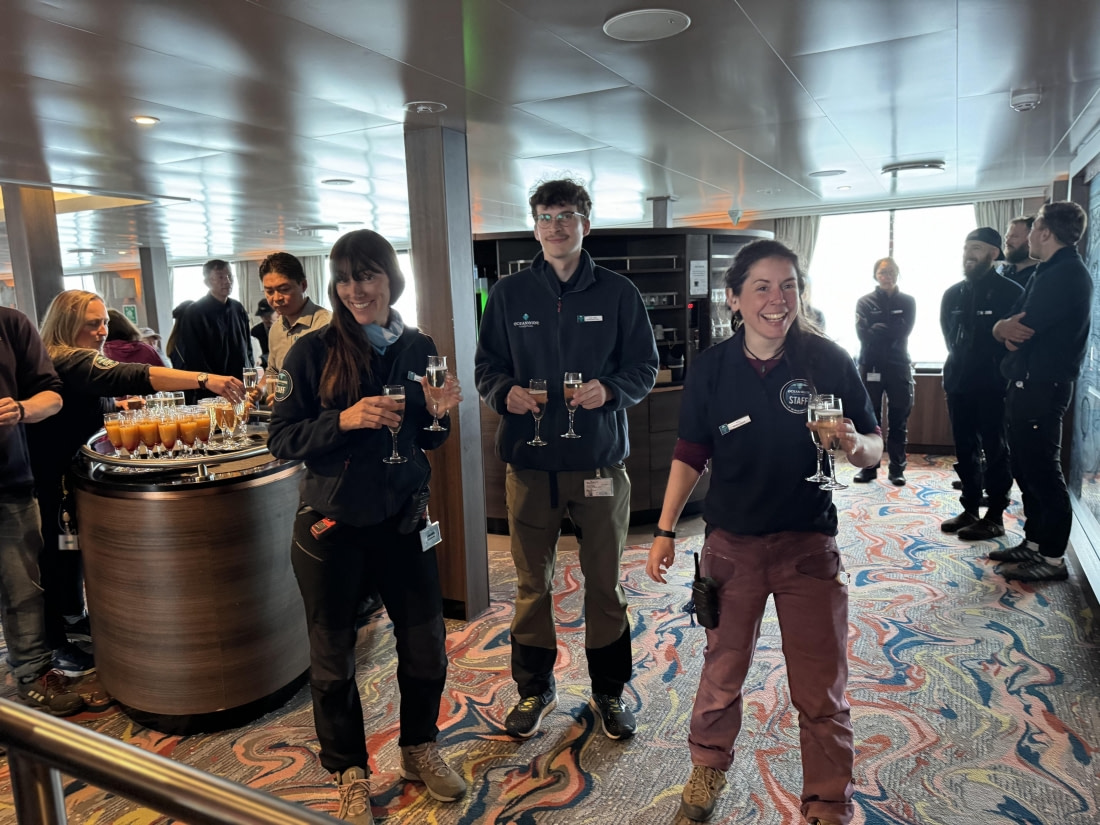 Hoewel de dag vrij somber was, was het terrein bezaaid met kleurrijke bloemen: paarse saxifrages, witjesgras, bergasterren en Svalbard klaprozen lieten ons kennismaken met de kleurrijke wereld van de Arctische toendra. Grillige rotsblokken en gletsjermorenen vertelden ons over de lange geschiedenis van de gletsjers in Spitsbergen en na het verzamelen van de groepen bij de kustlijn werd de klassieke Polar Plunge uitgevoerd.