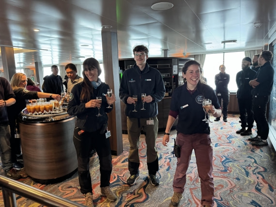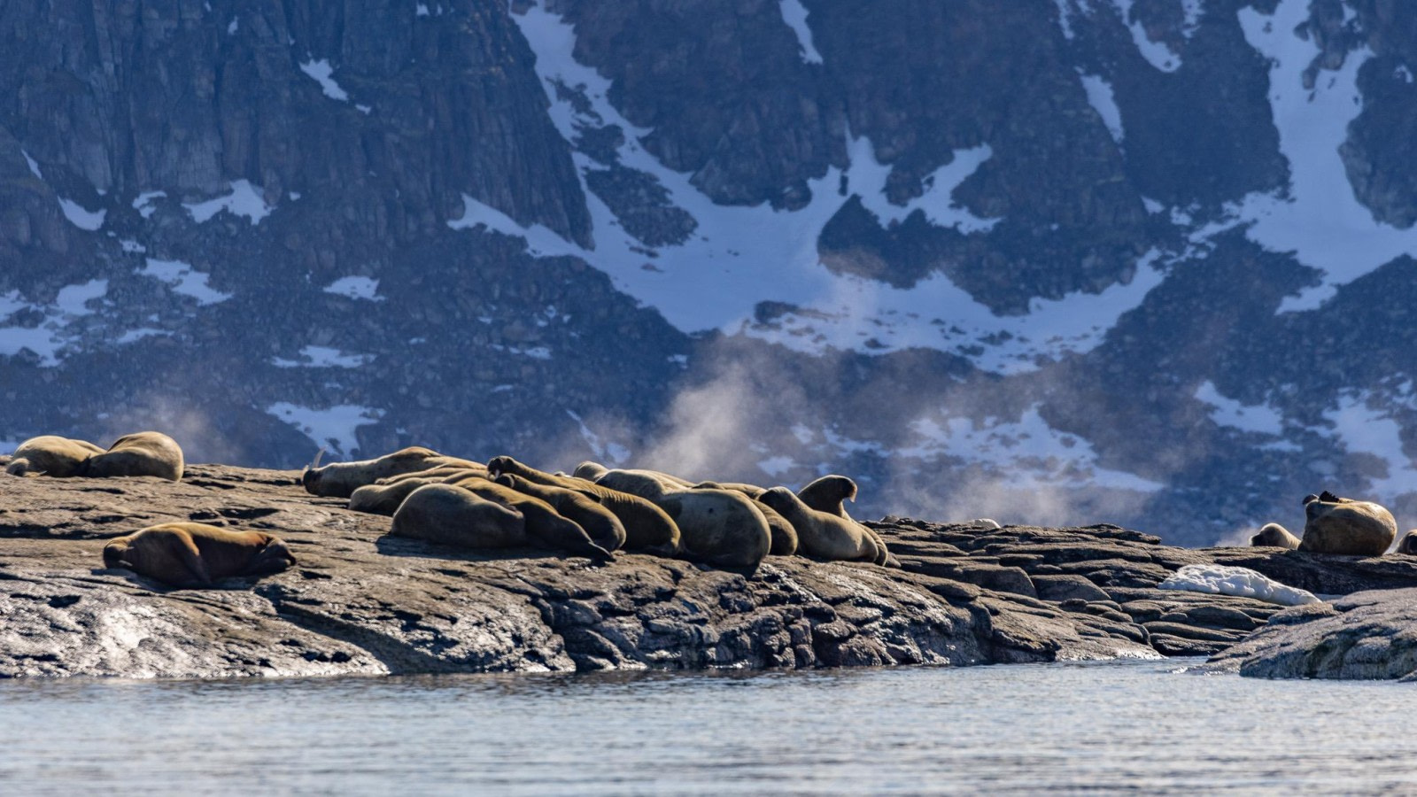 Tijdens de avondrecapitulatie vertelde Marco over informatie over gletsjervorming en -dynamiek, waarbij we leerden over het schommelende gedrag van de Monacobreen gletsjer, afgerond met Simon's leuke weetjes over de Noordse Stern. Meteen na het diner werd 80° Noord aangekondigd op het PA-systeem en verscheen het zandeiland Moffen, bezaaid met een talrijke groep Walrussen, aan de horizon in de mist.
