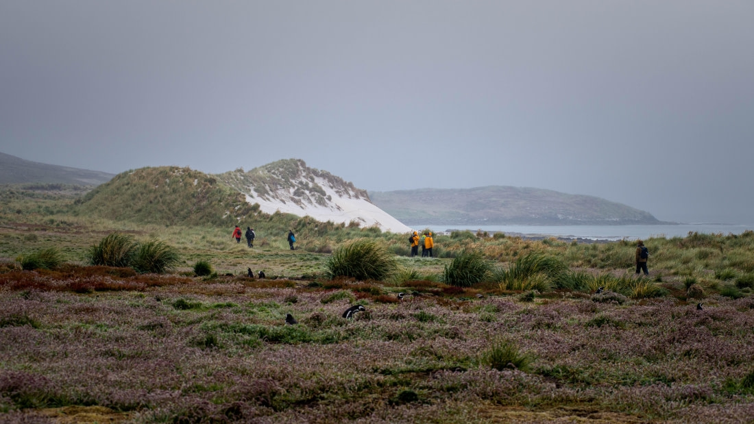 On the shore, Chris, Marcello, Julian, Pierre, Ashleigh, and other members of the expedition team were already waiting for us. The Zodiacs nosed into the white Falkland sand, and one by one, we climbed onto the shore, swinging our legs over the side. The beach was shallow, and it was low tide, so the Zodiacs had to stop slightly short of the shore when their bottoms began to brush against the fine Falkland sand. Accordingly, before confidently setting foot on land, we had to take about a dozen steps ankle-deep in water. Thankfully, each of us was wearing rubber boots, so walking through the water posed no problem.