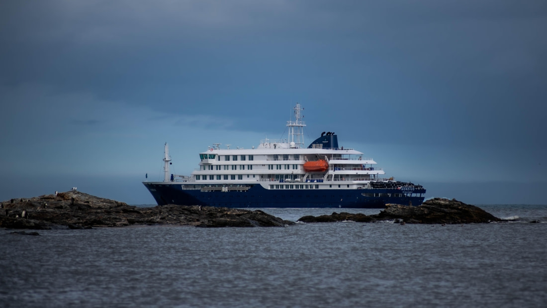 Chris stood leaning against the dashboard. Through the windows of the captain's bridge, the blurry outlines of approaching land could be discerned. The Hondius ship, gently swaying from side to side and cutting through the waves with its powerful bow, was approaching the Falkland Islands (Las Malvinas).