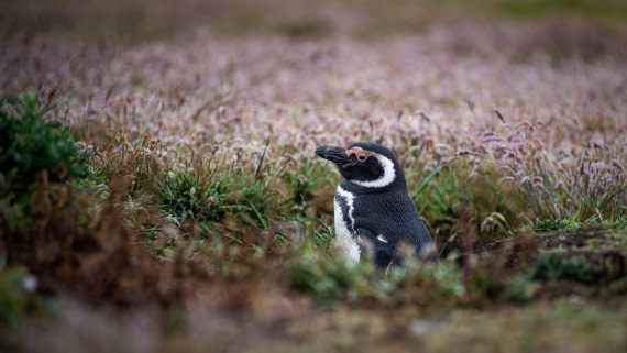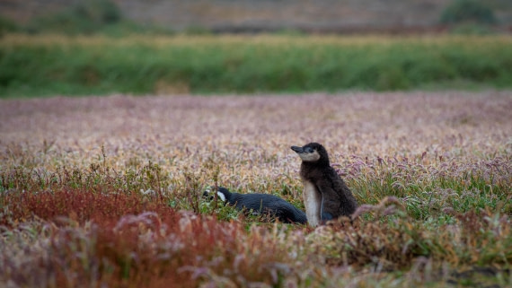And here are our first penguins — Magellanic penguins! They are quite small, peculiar, constantly waddling and assisting themselves with their wings. Nevertheless, they are completely unbothered by it, strolling along the beach and looking in different directions. Instead of building nests, they dig deep burrows and sit in them, waiting for the arrival of their offspring. Yes, it's dark and dirty, but no skuas will ever steal their eggs. Well, except for the occasional curious penguin chick, wanting to see what lies beyond the burrow, inadvertently emerges on the surface — and here the troubles begin. The malicious skua only needs that, instantly diving down, grabbing the little one, and that's it. It sits somewhere on a rock and pecks at its bloody catch. We also watched Commerson’s dolphins surfing in the waves remarkably near to the shore.