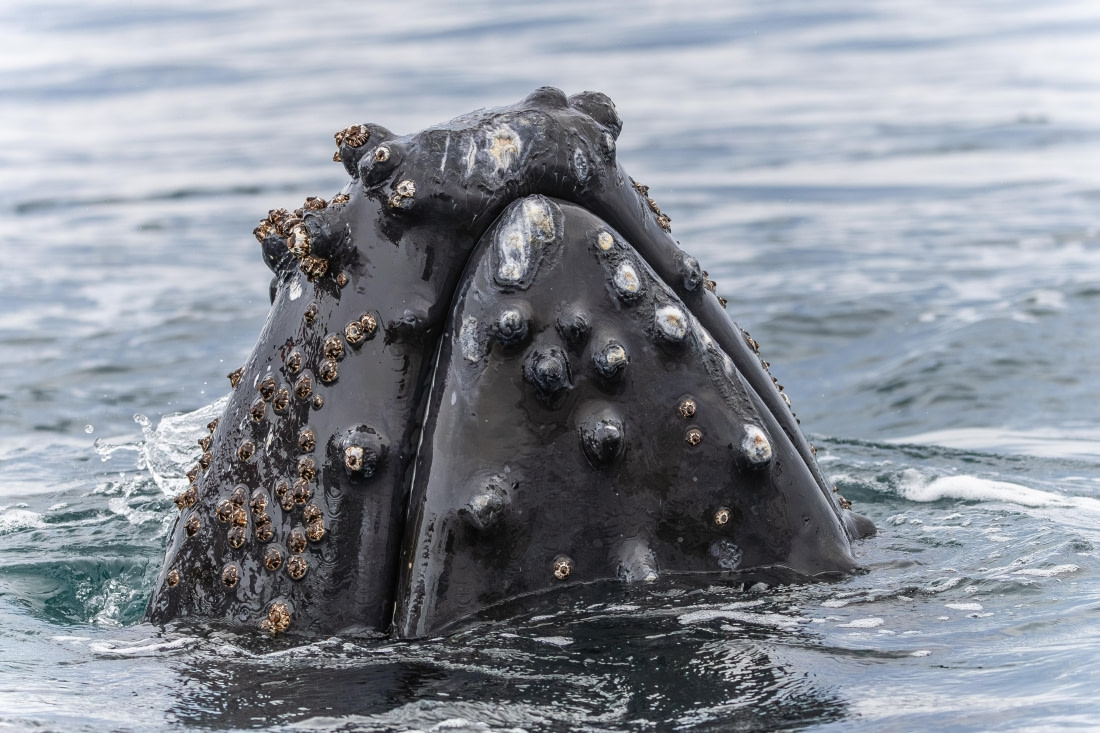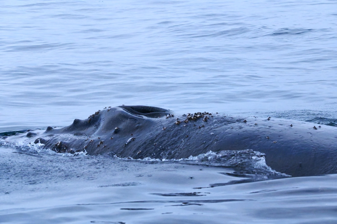 The rest of us stayed out on the water, and that was where the day seemed to crescendo. Humpback whales surrounded us—dozens of them, far more than we could count at first. They weren’t distant figures anymore; they came close, curious and playful. We watched them roll, their massive bodies turning gracefully beneath the surface. Some spy-hopped, lifting their heads to look at us directly, as if just as intrigued. Others slapped fins or flukes, showing off in a way that felt almost intentional. It was a spectacle—wild, generous, and deeply moving. We had felt small, but in the best possible way.