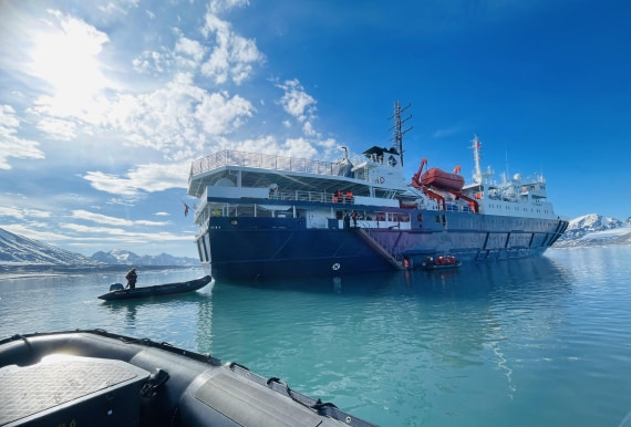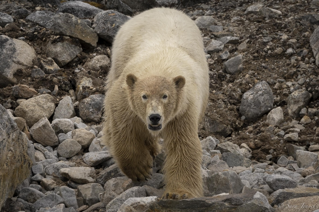De stafradio's knetterden toen er een melding binnenkwam van de Ortelius brugwacht dat er een Ijsbeer was gezien door officier cadet Erik! Assistent-expeditieleider Claudio werd met een zodiak op onderzoek uitgestuurd. Het was aan de overkant van het water, in een baai genaamd Virgohamna op Danskøya (Danes Eiland). Expeditieleider Sara nam onmiddellijk de beslissing om onze landing te sluiten en alle gasten zo snel mogelijk van land te halen, niet omdat we gevaar liepen voor de beer, maar omdat het een fantastische kans bood om dit prachtige dier te zien. Ze vroeg dat alle overgebleven zodiacs vanaf het schip te water gelaten zouden worden en dat alle gasten er onmiddellijk in zouden stappen. Sommigen van ons waren al terug aan boord en hadden onze outdoorkleding al uit, maar de spannende aankondiging dat we een kijkje gingen nemen bij de beer deed ons in alle haast onze waterdichte kleding weer aantrekken! De zodiacs verzamelden zich vlak bij Virgohamna en naderden langzaam de plek waar de beer genoot van een ontspannen wandeling langs de waterlijn. Onze gidsen identificeerden al snel dat het een jong mannetje was, misschien pas drie of vier jaar oud. Het beste nieuws was dat hij in fantastische conditie was met gezonde vetafzettingen op alle juiste plaatsen voor een ijsbeer! De zodiacs lagen vlak voor de kust en de beer liep rustig langs ons heen, stopte af en toe om ons te bekijken en de lucht op te snuiven. Op een gegeven moment stopte hij om een door mensen gemaakt relikwie dat tussen de rotsen lag te betasten. Het was echt een fenomenale ontmoeting met het wezen dat we allemaal naar het hoge noordpoolgebied hadden gereisd in de hoop het te zien. Sommige mensen huilden van de ervaring en vrijwel iedereen was sprakeloos. Onder de duizenden foto's die van dit prachtige schepsel werden genomen, bevonden zich enkele echt spectaculaire kadervullende beelden.