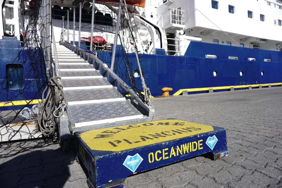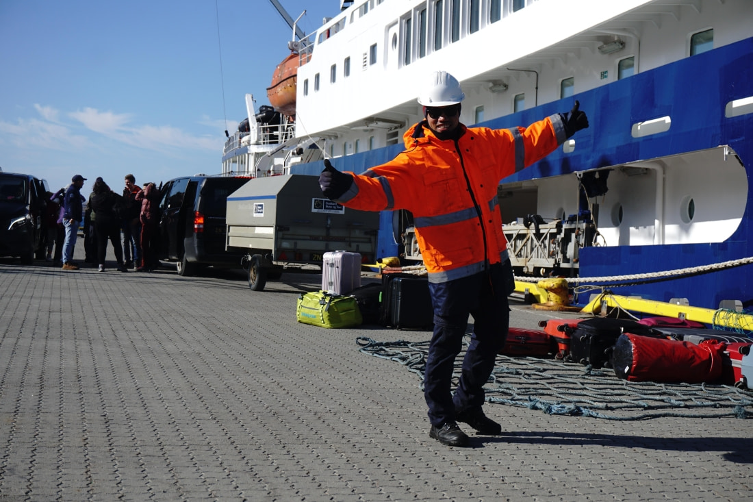 We moesten wachten tot we aan boord konden gaan van de Zodiac bij de loopplank. Onze lieftallige dokter Annelou orkestreerde het hele proces en liet groepen van tien mensen de loopplank afdalen en in de boten plaatsnemen. Bovendien zorgde ze ervoor dat onze reddingsvesten werden gedragen en goed werden vastgemaakt.