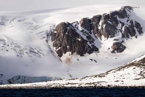 Of de wind nu sterker was geworden, de nabijheid van de gletsjer een rol speelde of omdat je zittend in de Zodiac niet veel beweegt, het leek hier beduidend kouder. We bewogen ons langzaam langs de voorkant van de gletsjer en bekeken de enorme ijsmassa's, die op sommige plaatsen gebarsten waren. Hier en daar kon je baardrobben zien rusten op ijsschotsen. Helaas waren ze vrij ver weg, maar met een verrekijker kon je ze vrij goed zien. Drieteenmeeuwen en Noordse Sternen, die een paar ijsschotsen hadden uitgekozen, draaiden hun kop naar ons. De sterns tsjilpten ook dreigend.