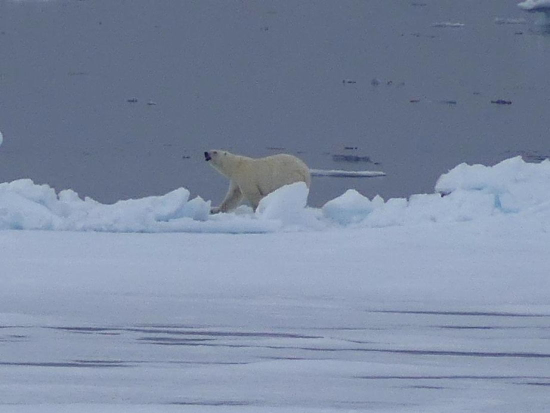 Gedurende de nacht voeren we noordwaarts langs de westkust. We werden wakker in de noordwestelijke hoek van het hoofdeiland van de archipel en naderden een smalle doorgang, Sorgatted genaamd, tussen Spitsbergen en Danskøya. De kustlijn en de vorm van de bergen verschilden volledig van die in de omgeving van Longyearbyen, niet vlak aan de bovenkant, nu puntig. Terwijl we de passage naderden, zagen we een Ijsbeer en plotseling was het hele schip wakker, sommigen van ons lagen op dat moment nog in bed omdat het nog geen ontbijttijd was. De beer liep op een berghelling en was vrij moeilijk te zien, maar de meesten van ons slaagden erin een kijkje te nemen met behulp van een verrekijker. Het was geweldig om te zien hoe hij voortdurend in een langzaam tempo liep, waarschijnlijk op zoek naar iets te eten. Later ging hij de Magdalenefjord in en wij gingen verder, op weg naar Sorgatted.