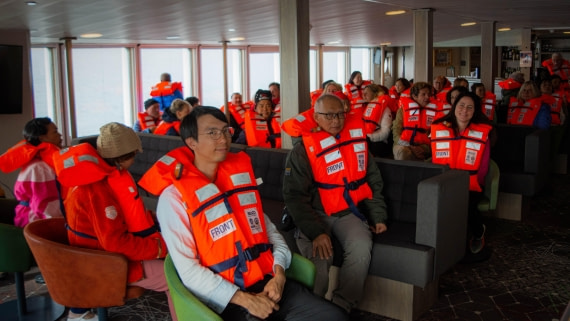 Terwijl de bemanning ervoor zorgde dat we de haven netjes verlieten, nodigde onze expeditieleider Phillipp ons uit in de lounge voor de Captain's Cocktails, waar we onze kapitein Ernesto Barria en de rest van het expeditieteam ontmoetten. We vierden onze expeditie met wat bubbels en canapes voordat we werden opgeroepen voor de laatste activiteit van de dag: het diner!