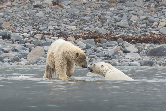Twee van de beren waren aan het spelen toen we aankwamen. Terwijl we keken zagen we dat het een moeder was met een jong, waarschijnlijk iets ouder dan 2 jaar, bijna klaar om zijn moeder te verlaten. Hij leerde hoe hij op zeehonden moest jagen, een nuttige vaardigheid als er in de baai ernaast een kolonie zeehonden woont.