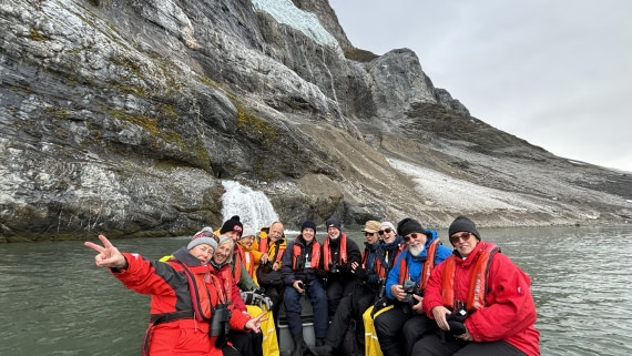 Net toen we de open zee bereikten en aan slapen dachten, kwam er een oproep op het PA-systeem - er was een walvis gezien. Al snel werd vastgesteld dat het een blauwe vinvis was en Plancius draaide zich om in de hoop hem beter te kunnen bekijken. Onze hoop werd werkelijkheid toen de walvis heel dicht bij het schip opdook. We vonden het geweldig om de grootte en kracht van dit prachtige dier te zien toen hij twee keer langszij kwam. Toen was het tijd om terug te keren naar onze hutten om ons voor te bereiden op het avontuur van morgen, zelfs met het eindeloze daglicht.