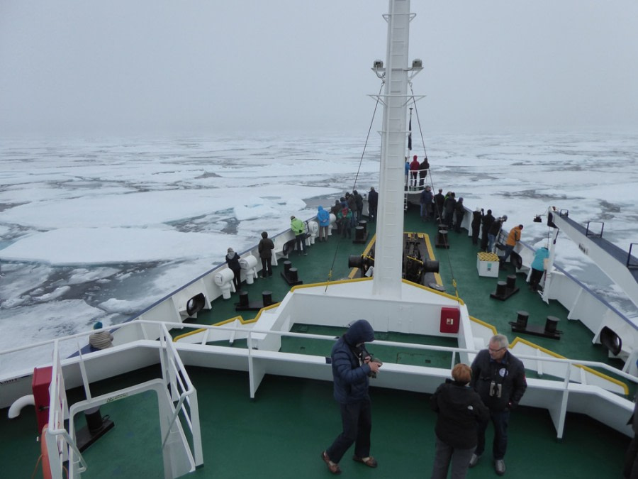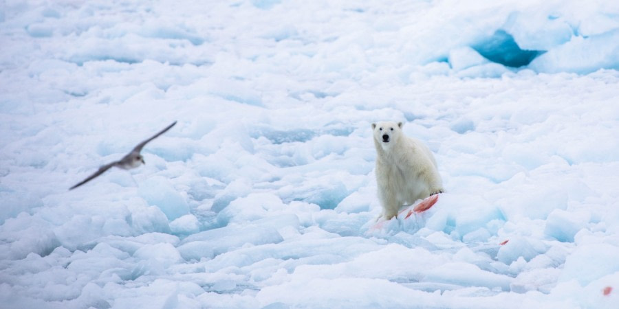 When I suddenly found myself and the ship in the middle of a seemingly endless pack ice, everyone was silent. The world seemed stopped – frozen in time. As the vessel kept pushing the ice, a closer look at the pack ice revealed fresh polar bears footprints, and they were EVERYWHERE. Anticipation kept building until finally, a polar bear was spotted, standing next to what seemed to be the remains of a meal. We were in such close proximity to the bear that many guests found it unreal. Then the camera shutters started working full speed for about 30 minutes. That was definitely the highlight of the whole voyage – an unforgettable experience of a lifetime.
