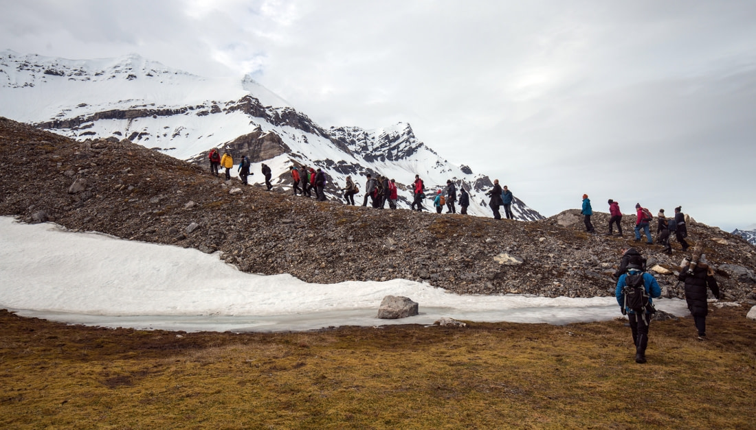 From Trygghamna you walk to Alkhornet, a large seabird cliff where the birds are scouting out breeding places. Below the cliffs is a common place to spot Arctic foxes, and you may also see reindeer grazing on the lush vegetation if there’s not too much snow.