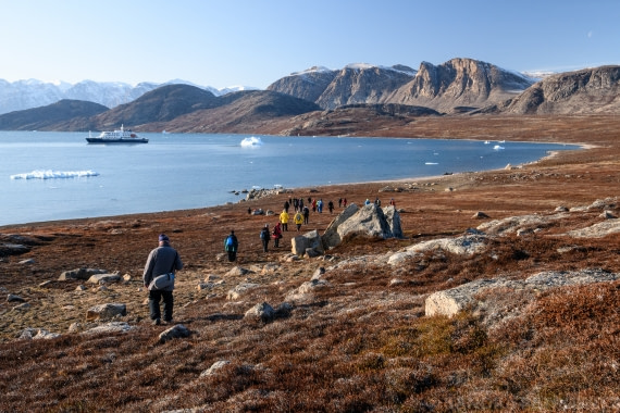 Sydkap is a ruggedly beautiful landing area in Greenland’s impressive Scoresby Sund fjord system. As we walk along the relatively low-laying terrain here, you can see the grounded icebergs of Hall Bredning. We may even stop the ship there so you can get some sense of scale, comparing the size of these icy giants against our vessel.