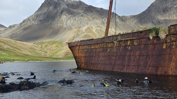 Antarctica's dazzling icecaps, colossal glaciers, and towering mountains are rivaled only by the sub-Antarctic islands' white-sand beaches and intriguing flora and fauna. Both areas host many penguins, whales, seals, and seabirds. Our Antarctic snorkel program is similar to our Arctic program. We snorkel directly from our Zodiacs, encountering polar marine life, and sometimes shipwrecks. During these snorkel sessions, you may observe penguins, fur seals, and perhaps even leopard seals. Many of the sub-Antarctic islands are also rich in krill, one of the prime food sources for many marine species, such as whales, and, therefore, highly useful in locating wildlife. In Antarctica, you can snorkel in the Falkland Islands, South Georgia, and the Antarctic Peninsula.